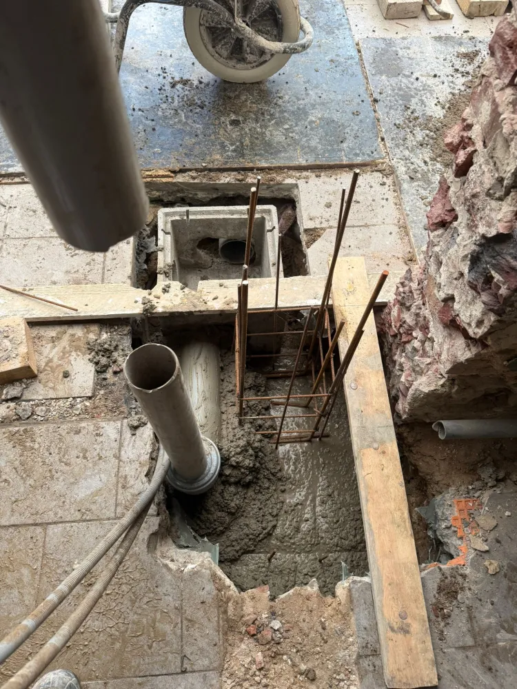 La démolition de deux murs porteurs et création d’un poteau en béton armé avec ferraillage vertical conçu sur mesure afin de s’adapter à l’évacuation du WC existant.